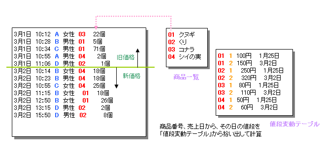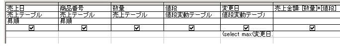 SELECT 売上テーブル.売上日, 売上テーブル.商品番号, 売上テーブル.数量, 値段変動テーブル.値段, 値段変動テーブル.変更日