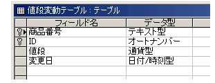 ここから、新しく商品を登録した場合や値段を変更した場合、さっき作った「値段変更テーブル」にレコードが追加されていかないとならないわけなんです。ここんとこが工夫のしどころなんですが・・・。