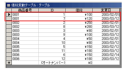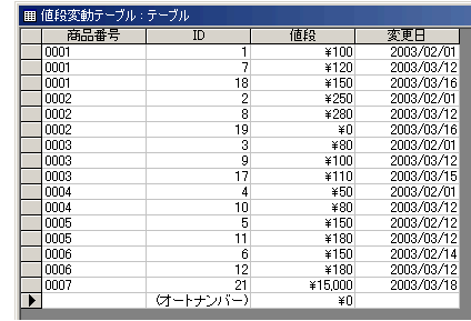 このテーブルの内容はこんな感じです。商品それぞれ、いつ、どういう値段に変わったのか・・・という履歴が残るテーブルです。
