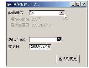 で、商品番号を「コンボボックス」にして、一覧から「値段の変更を行う商品」を選択できるようにしてみました。