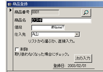 もう、「商品マスター」からフィールドを削除しちゃったので、コントロールソースがないよ、という意味で#Name? となっちゃってますね。