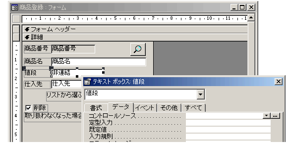 まず、「値段」のテキストボックスのコントロールソース欄を↑空っぽにして、非連結のテキストボックスにします。