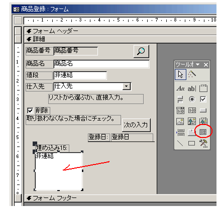 ツールボックスから、「サブフォーム/サブレポート」というボタンをクリックして、フォーム内をクリックし、「埋め込みオブジェクト」を作ります。