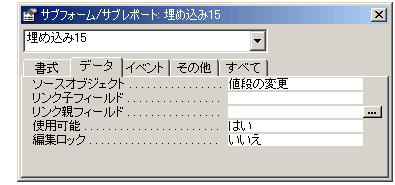 そうすると、今開いているフォームと、値段の変更フォームそれぞれが基にしているテーブルに「主キー」がある関係で、勝手に「リンク子/親フィールド」欄になんかフィールド名が入ってしまいます。