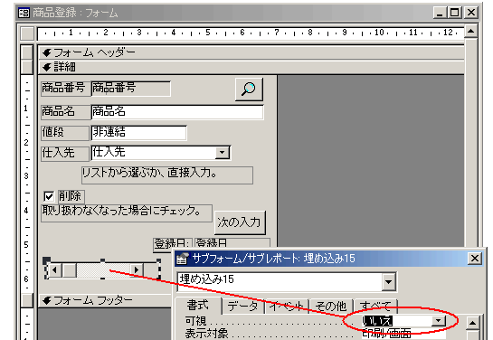 テーブルの中に値が代入されていることが確認できたら、、商品登録のフォームのほうをもう一度開いて、「埋め込みオブジェクト」を小さく小さくして、「可視しない」状態にしておくといいでしょう。