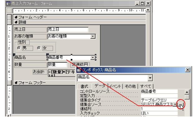 こいつのプロパティで、「ソースオブジェクト」欄に、さっき作った、値段の変更をするときのフォーム(値段の変更)を選びます。