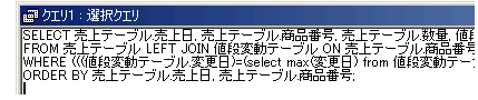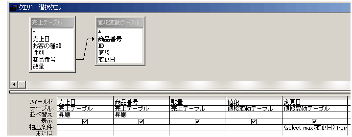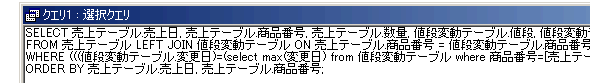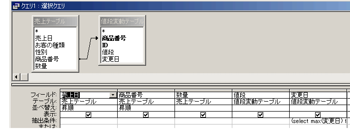 WHERE (((値段変動テーブル.変更日)=(select max(変更日) from 値段変動テーブル where 商品番号=[売上テーブル].[商品番号]