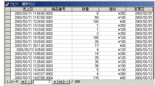 ただ、このQ_売上一覧を通じては、追加入力・更新ができないので、売上入力をするときとかはやっぱり苦労して「現時点での値段」をがんばって出さないとならないんですよね。プログラミングの技術のある人ならどうってことないんでしょうが、マイケルにはちょっと辛いかな・・・。