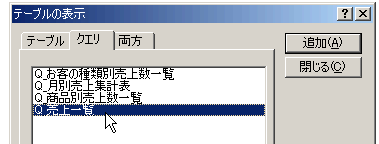 クエリを新規に作成して、最初にテーブルを選択する状態になりますでしょう。「テーブルの表示」っていうウィンドウ。