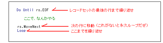 また、MoveNextというメソッドをやらないと、永久に1レコード目を読み取りつづけますので、これも注意が必要ですよ。