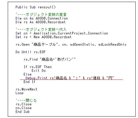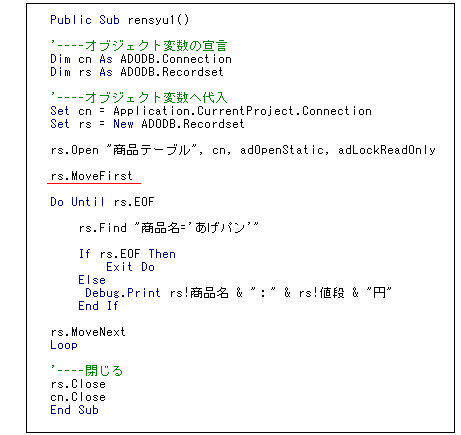 多分、Openした直後は、1レコード目にカーソルが来ているもんなんだとは思いますが・・・もし万が一のことがあって、途中から検索が始まっちゃったりしたら、正しい結果が出ませんからね。