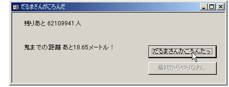 「だるまさんがころんだっ」というボタンをクリックすると、距離が縮まり、動いちゃって鬼につかまっちゃった人が出て残りの人数が減ります。