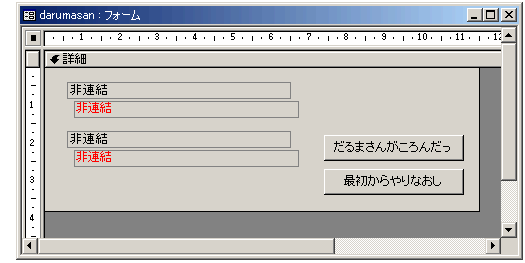 このフォームの、各イベントで、ちょっとしたプロシージャを動かすことによって、「だるまさんがころんだ中継」みたいなゲーム(とはとても言えないような粗末なものですが)ができるわけです。