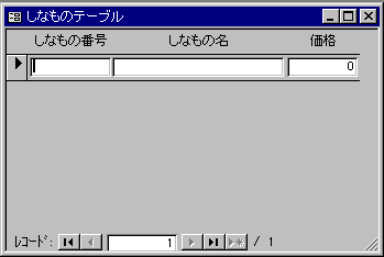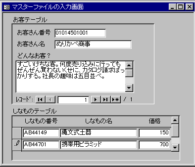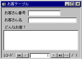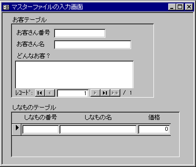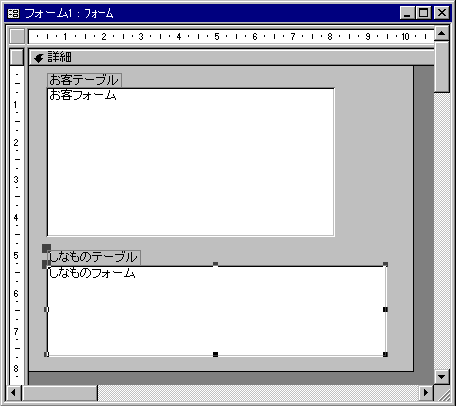 フォームはどんなのでもいいんですけど、あたしは、「お客テーブル」の方は単票形式で、「しなものてーぶる」の方は表形式で作ってみました。