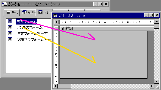 で、上の図のように、うまくデータベースウィンドウと重ねあわせて、いまし方作ったふたつのフォームをドラッグします。
