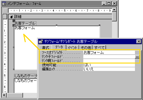 もし、メインフォームとサブフォームが基にしているテーブル同士が、リレーションシップオブジェクトの中で結びついていたとしたら、このプロパティには両方のテーブルを結び付けるフィールド名が入っているはずです。