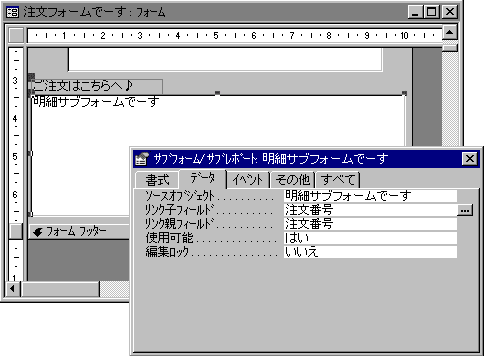 デザインビューの状態で、サブフォームコントロール部分のプロパティを見てみると、メインフォームとどういうふうに結びつくのか、結びつきを見ることができます。