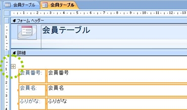そうそう。テキストボックスの中身です。レイアウトビューでは「会員テーブル」のデータが表示されていたのに対し、このデザインビューでは、テキストボックスの”名前”が表示されています。