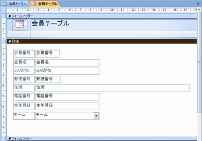 最後に、フォームの見出し部分を変えておきましょう。今、「会員テーブル」となっていると思うんですが、”テーブル”という言葉がちょっとわかりにくいかなと思うんで、”会員情報照会”とか、そんな見出しに変えておこうと思います。