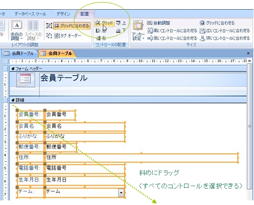 右の図のように、斜めにドラッグすると、その範囲内にあるコントロールを全部選択できます。